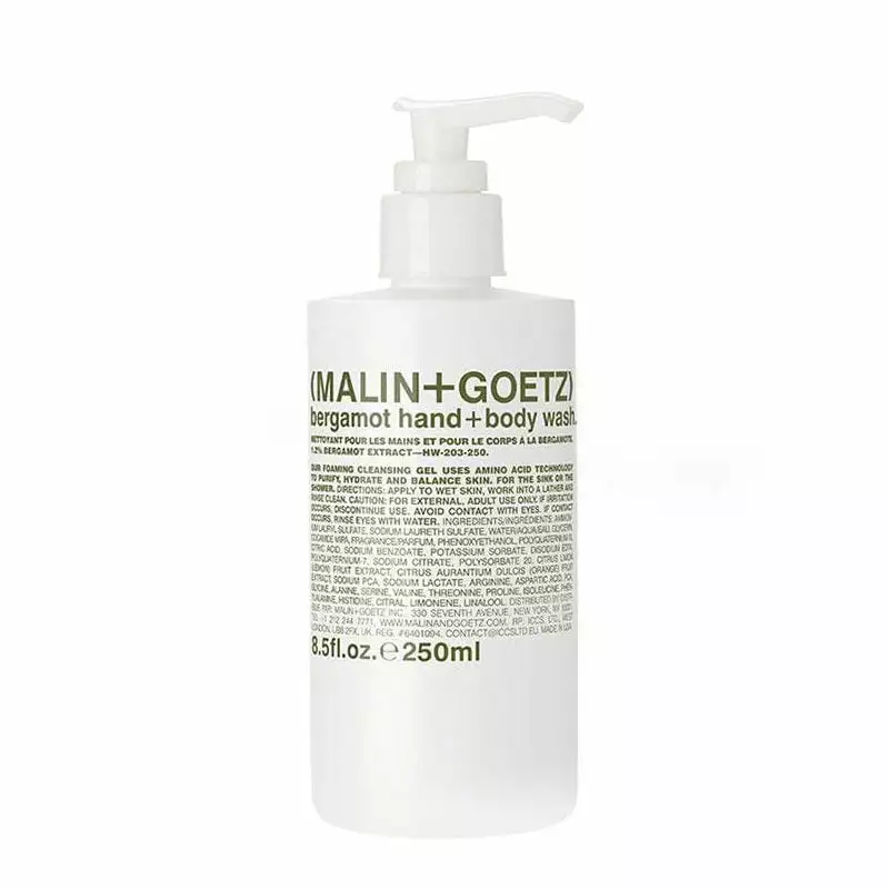 The Malin + Goetz Bargamot Hand & Bodywash 250ml purifies and balances all skin types. The cleansing gel has amino acid-based cleansing agents and hydrating glycerin with a natural hydration. + amino acids + glycerin hydrate. + bergamot refreshes without leaving a lasting scent.