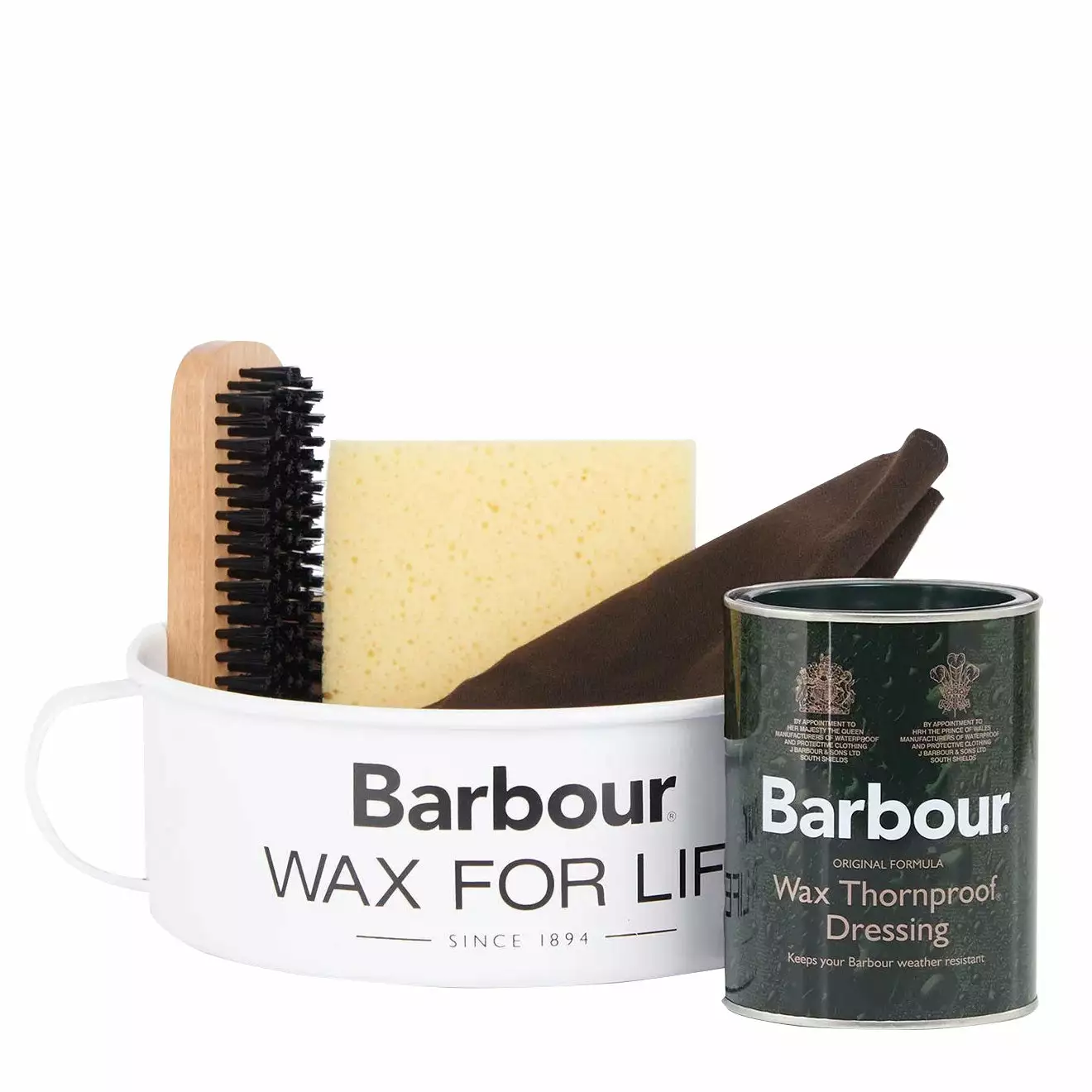 Look after your beloved outerwear with the Barbour Luxury Jacket Care Kit. Includes a tin of reproofing wax, a branded brush and a card with instructions, a handled metal bowl, a cellulose applicator and a premium moleskin cloth.